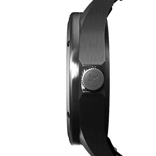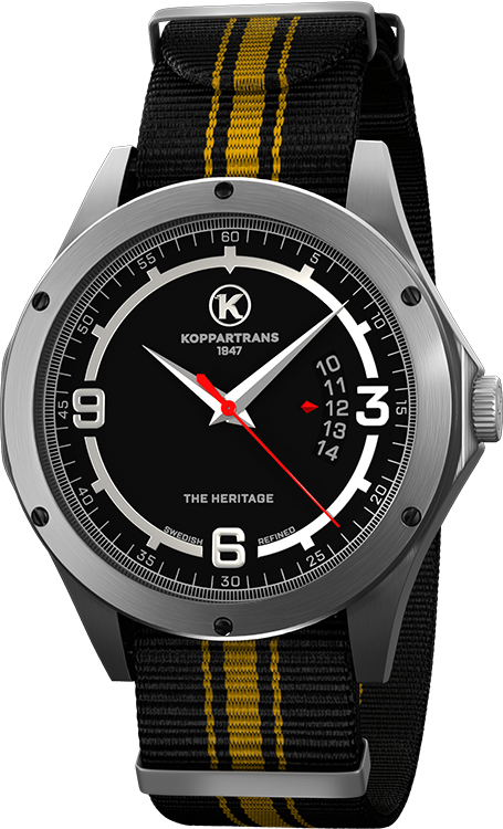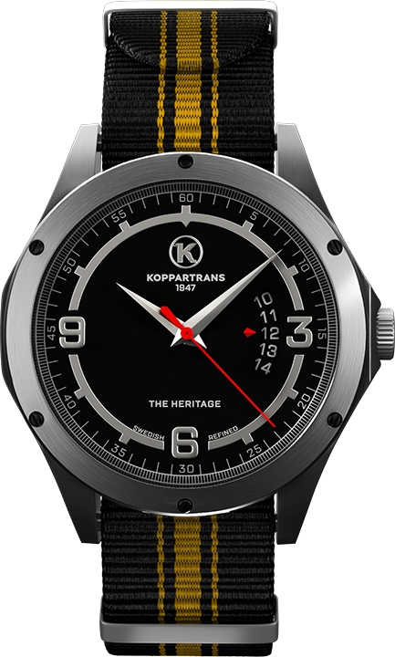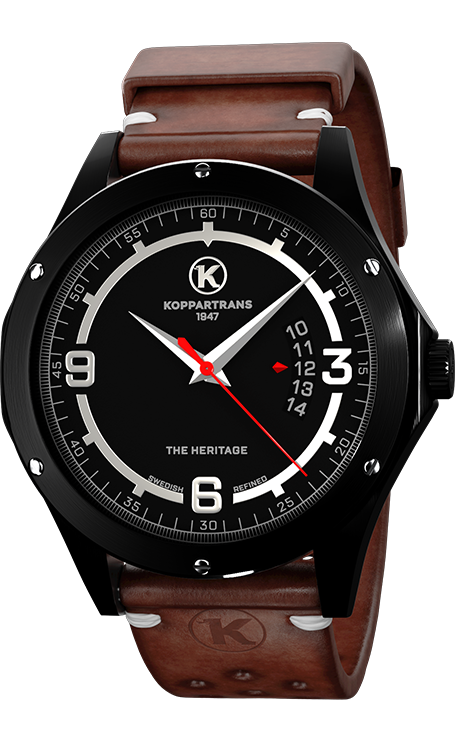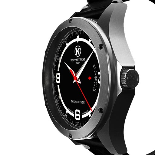 The powerful logo has been transformed into the dial of the watch. The circle in the dial has been adjusted to give space for the figures 3, 6 and 9. Note that the dates are shown in the unique window shown by the edge of a red arrow symbolizing the red tounge in the Koppartrans logo. The case is inspired by a fuel cap and the rims with it's nut bolts.